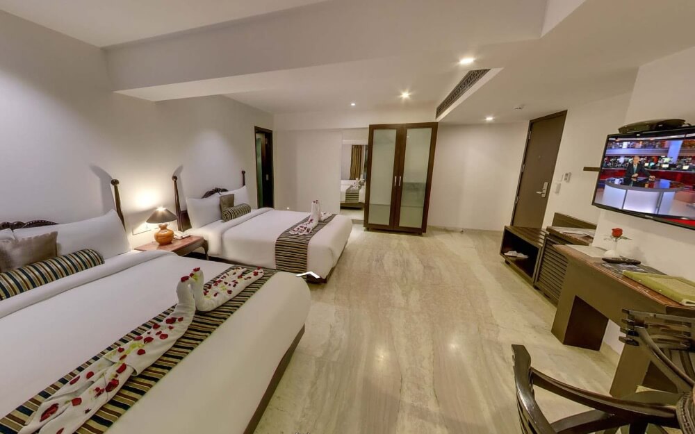 Deluxe suite with two queen beds and elegant decor, equipped with modern amenities.