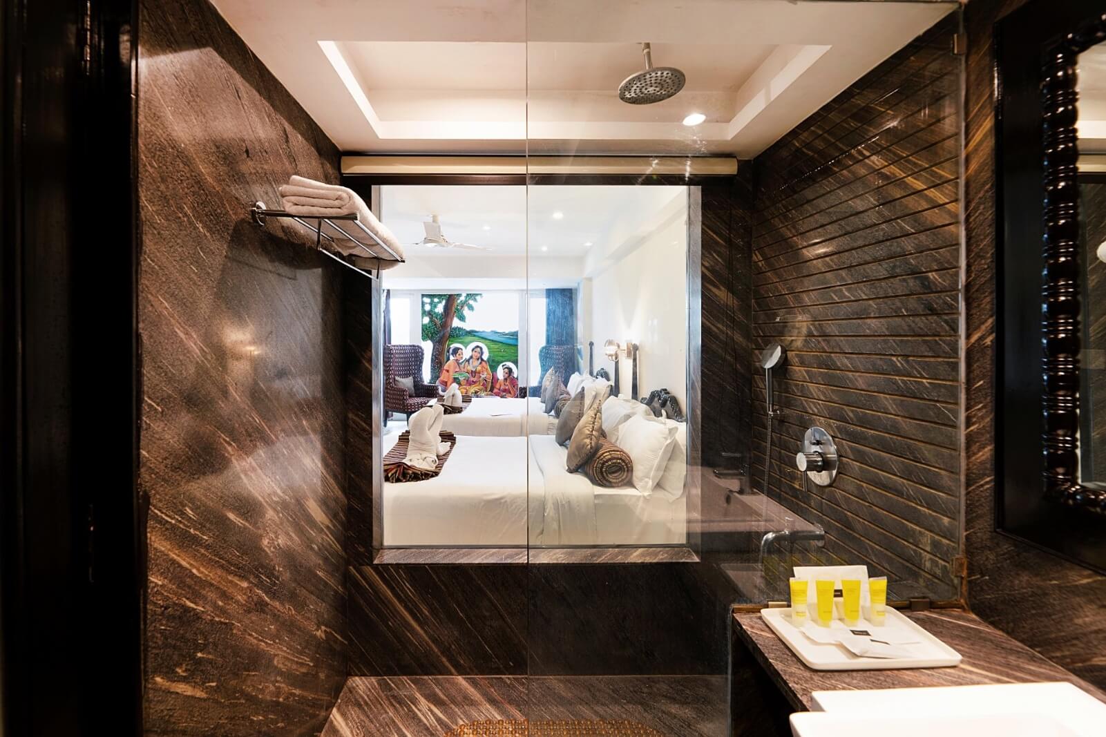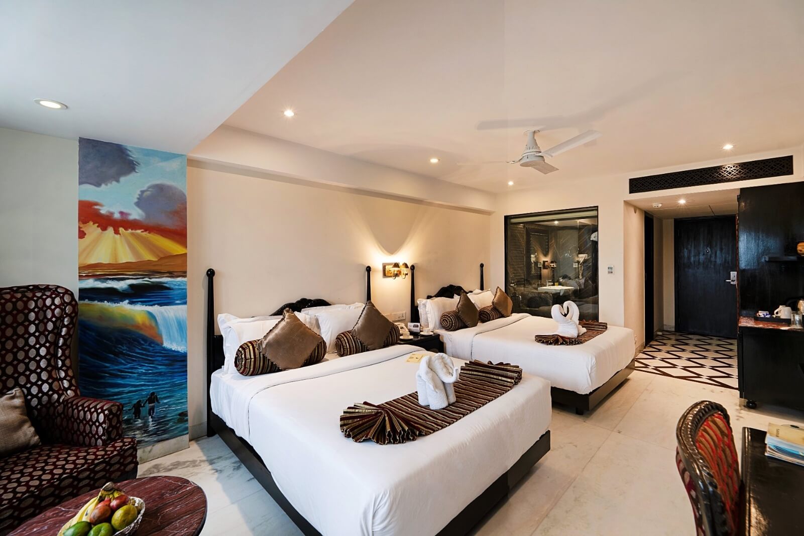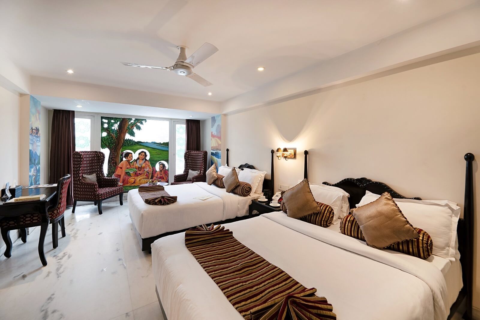 The Deluxe Suite offers a serene retreat with exquisite artwork adorning the glass windows. The suite features two queen-size beds with 12-inch royal pocket spring mattresses for extra comfort, and a well-appointed bathroom with a shower cubicle and modern toiletries.