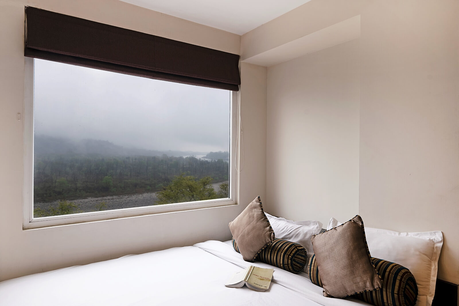 The Ganga Royal Suite offers breathtaking views of the river Ganga and Rajaji Elephant National Park. The suite features a king-size bed and a double bed with plush pillows for a restful sleep. The spacious bathroom includes a bathtub, separate shower, marble, and complimentary toiletries, adding to the luxurious feel.